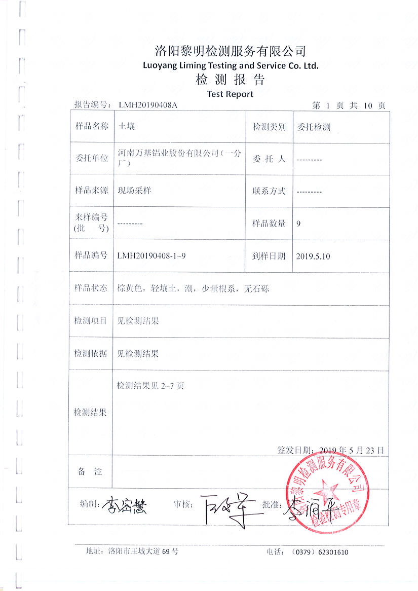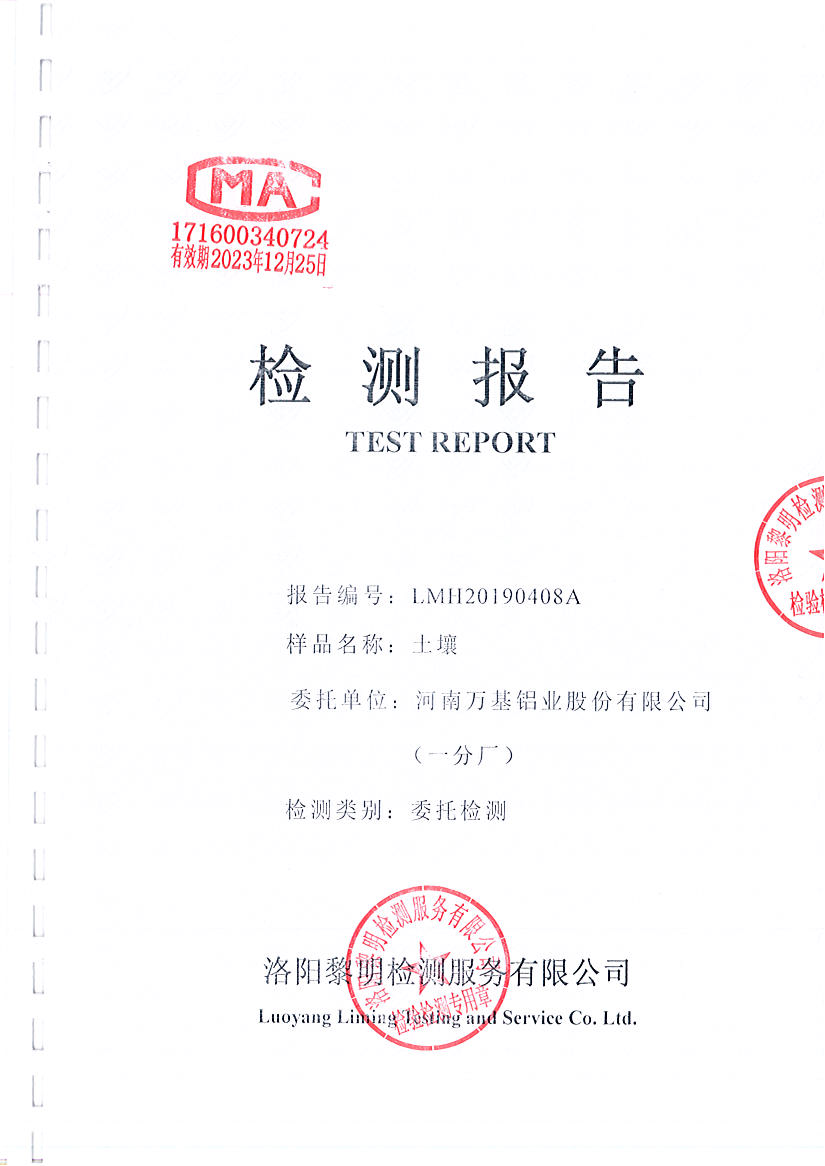 河南萬基鋁業(yè)股份有限公司(一分廠)土壤檢測(cè)報(bào)告公示